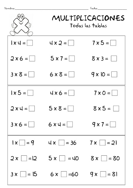 Hola chicos, os adjunto fichas para repasar las tablas de multiplicar durante este puente.